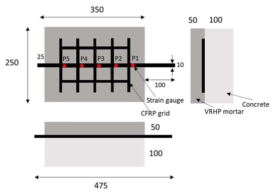 Schematics of FRP grid/concrete/VRHP mortar composites (Units: mm).
