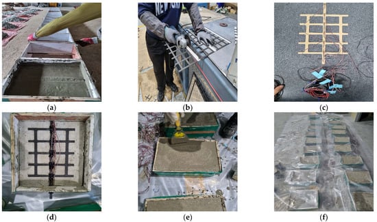 Specimen fabrication of FRP-grid-reinforced concrete with VRHP mortar. (a) Concrete casting. (b) FRP grid fabrication. (c) Installation of strain gauge. (d) FRP grid installation on. concrete. (e) VRHP mortar casting. (f) Curing FRP grid reinforced concrete.