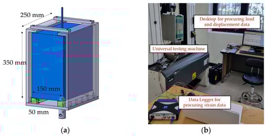 After curing the VRHP mortar, all samples of FRP grid/concrete/VRHP composites were tested using the pull-out test. The pull-out test process was designed based on research conducted by Wang et al. [25]. Figure 3a shows the schematic of a jig for holding the composites during the pull-out test. By connecting the exposed FRP grid on the jig with the INSTRON 5982 (Instron Co., Norwood, MA, USA), a tensile load was applied only to the FRP grid, while the composite was fixed by the jig. The pull-out test setup was installed as shown in Figure 3b. The tensile load was applied to the composites at a rate of 2 mm/min during the pull-out test. The strain gauge and universal testing systems (UTM) data were collected using a connected computer.