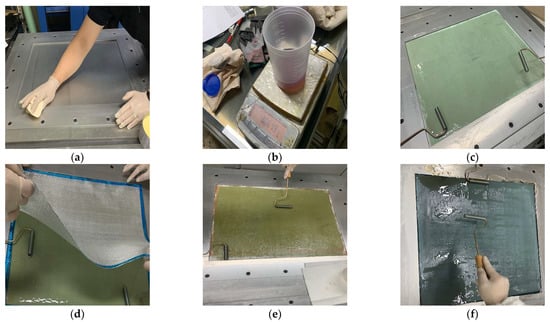 The hand lay-up method is a method in which a worker manually laminates a textile fabric to form a product. It is a manufacturing method with advantages of low investment cost, relatively easy construction, simple required equipment, and fast curing time. However, the physical properties of the specimen are affected by the production capacity of the operator, and in order to achieve uniform quality, the operator’s skill is required, and the appearance of the specimen is not attractive due to the influence of manual work. In addition, there are problems such as the removal of air bubbles between the fabric and the resin and the optimization of the fiber content. The hand lay-up method is mainly used to produce a small number of products, not by mass production, and is used for boat shells, swimming pools, and bathtubs. In this study, the hand lay-up method was implemented as follows (Figure 4):