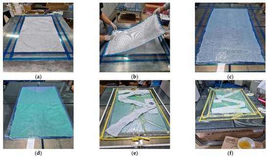 Specimen fabrication by resin infusion method. (a) Peel ply lamination. (b) Fabric lamination. (c) Release film lamination. (d) Mesh lamination. (e) Installation of omega flow and resin port. (f) Resin injection after vacuum bagging.