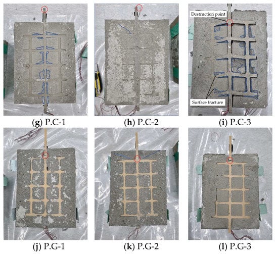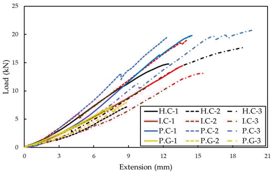 Figure 8 indicates the fracture mode of the composites after the pull-out test. The cutting process between the mortar and concrete was conducted to observe the destruction of the FRP grid and the surface fracture of the mortar. The red circle in the Figure 8 is the destroyed part of the FRP grid, and the blue line is the break line of the mortar. The crack in the mortar was not observed in the H.C and I.C specimens, and the CFRP grid was fractured in the load-bearing part. When the FRP grid is tensioned by a tensile load, the central axis of the FRP grid supports the dominant tensile stress, and the horizontal grid connected to it compresses the mortar by applying compressive stress to it. If the compressive strength of the mortar is higher than the compressive load applied by the horizontal grid, tensile failure of the FRP grid occurs before failure in the mortar specimen. The fractured part of the FRP grid embedded in the composites varies depending on the relationship between the tensile strength of the grid and the compressive strength of the mortar resisting the compressive stress of the horizontal grid. For the H.C and I.C specimens, the maximum tensile loads were 13.23 and 15.54 kN, respectively. The maximum loads applied to the H.C and I.C specimens were insufficient to cause compressive failure in the mortar, but the load could destroy the CFRP grid. The maximum tensile load of the P.C specimen was 20.02 kN, which was higher than that of H.C and I.C. Among them, P.C-3 showed the highest maximum tensile load of 20.77 kN. In the case of the P.C-3 specimen, it was observed that the mortar was destroyed before the destruction of the CFRP grid. Microcracks in the mortar were also observed in the P.C-1 and 2 specimens, but the damage to the CFRP grid was preferentially made such that the mortar was not destroyed.