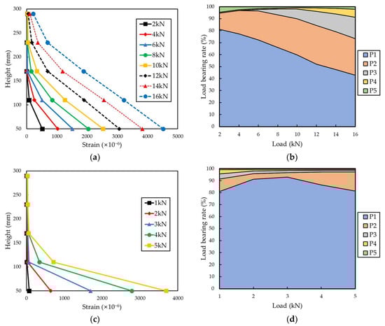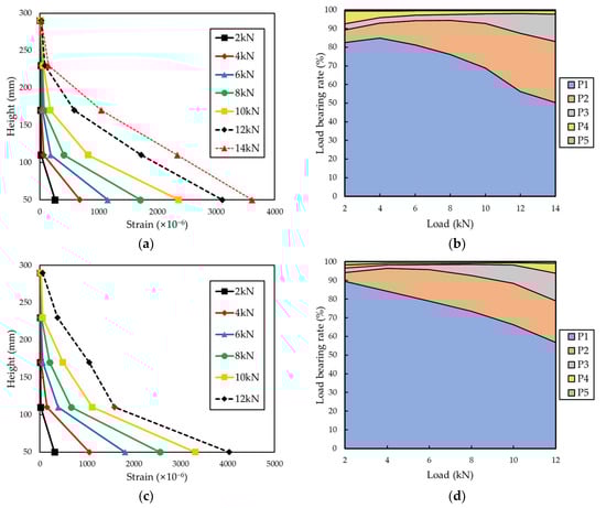 Tensile strain distribution and load-bearing rate of each point of P.C-1 and P.G-1. (a) Tensile strain distribution of P.C-1. (b) Load-bearing rate of each point of P.C-1. (c) Tensile strain distribution of P.G-1. (d) Load-bearing rate of each point of P.G-1.