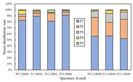 Figure 12 shows the distribution of partial tensile strain of the specimen under a low load of 2 kN, and a high load of 12 kN was investigated. In the case of the P.G specimen, the maximum tensile load was 7.43 kN; thus, it was excluded from the strain data with a load of 12 kN. The distribution of the four specimens at 2 kN and the strain distribution of the three specimens at 12 kN showed similar load distributions, respectively. The magnitude of the applied load has a dominant influence on the strain distribution of the FRP grid embedded in composites. In addition, as the magnitude of the load increased, the loads initially concentrated on the P1 grid point were distributed to the lower grid points.