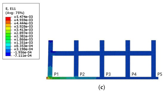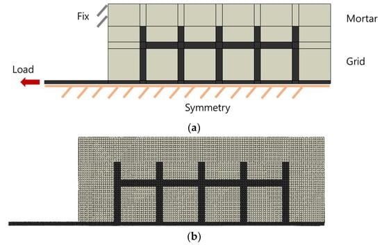 The geometry and boundary conditions of the model used for the finite element analysis (FEA) are shown in Figure 13a,b. ABAQUS commercial tools were used for finite element analysis. The finite element model uses two-dimensional and symmetric conditions to increase the efficiency of analysis. For the finite element model, grid parts and mortar parts were applied, and the concrete was modeled as boundary conditions. The element size is 3 mm × 3 mm, and the element type is C3D20R (20-node quadratic brick, reduced integration). Static general analysis was conducted and strain in the load direction was derived from grid points P1 to P5. For the analysis, two models, P.C and P.G types were set as the analysis case and analysis was performed.