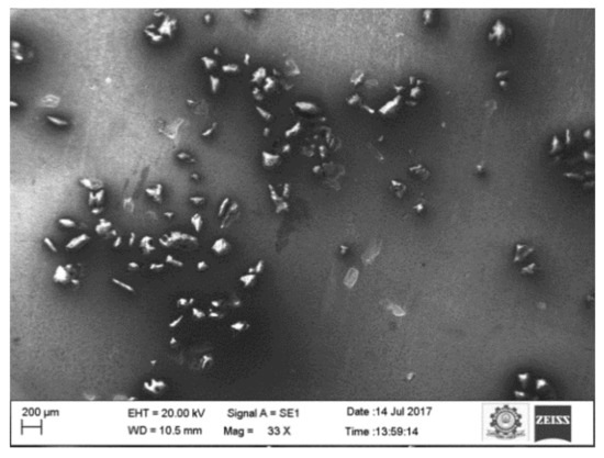 To ensure the uniform and homogenous distribution of the reinforcement particles, SEM (Carl Zeiss, One North Broadway, NY, USA) with a suitable accelerating voltage was applied. Back-Scattered Electron (BSE) mode was also used to observe the distribution of the reinforcement particles. Prior to metallographic studies, the specimen was perfectly polished in the polishing machine using SiC paper of various sizes. To observe the microstructure of the aluminum and its composites, the Keller reagent was prepared as per the standards and was used as an etching agent. Figure 1 shows a micrograph of the reinforced composites at 10 wt.%. The SEM images prove the uniform distribution of the reinforcement particles in the aluminum matrix.