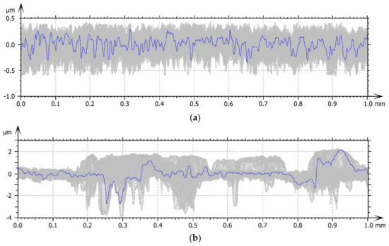 The results of the studies are presented in the form of tables and graphs. Table 3 presents the results of surface topography studies for two types of surfaces—those that characterized by lesser and greater roughness, which is described by parameter Ra—the arithmetical mean height of the profile (a parameter commonly used to assess surfaces). The value of the Ra parameter was determined for the 1024 profiles that were generated (using the advanced metrology software; function convert surface into series of profiles) and hence the given average value and standard deviation, which allowed us to conclude the measured areas of the tested samples—for Surface A, the Ra parameter was 0.095 µm ± 0.007, and for Surface B, the Ra parameter was 0.218 µm ± 0.086.