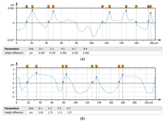 The analysis of the valleys (Figure 3) showed that on Surface A, their depth ranged from 0.338 µm to 0.414 µm, and on Surface B, it ranged from 1.69 µm to 2.28 µm. Additionally, some peaks (Figure 4) were observed on Surface A that ranged in height from 0.266 µm to 0.369 µm, and a lot of plateau peaks were observed on Surface B, which ranged in height from 1.11 µm to 2.02 µm.