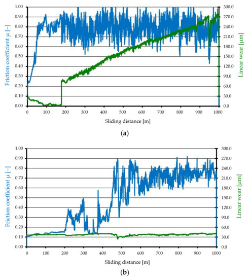 Tribological characteristics (studies without lubricant): (a) Surface A, (b) Surface B.