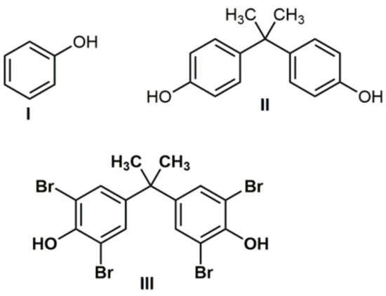 I—Phenol, II—4,4′-isopropylidenebisphenol (BPA); III—4,4′-Isopropylidenebis(2,6-dibromophenol) (TBBPA).