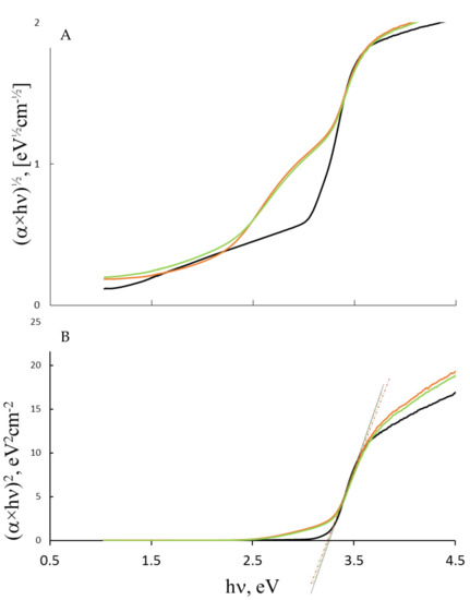 Here, n is 0.5 and 2 for indirect and direct transitions, respectively [34]. In plots of (αhν)n against hν, the optical band gap energy Ebg was determined by extrapolating the linear portion of the graph to (αhν)2 = 0 (Figure 4B).