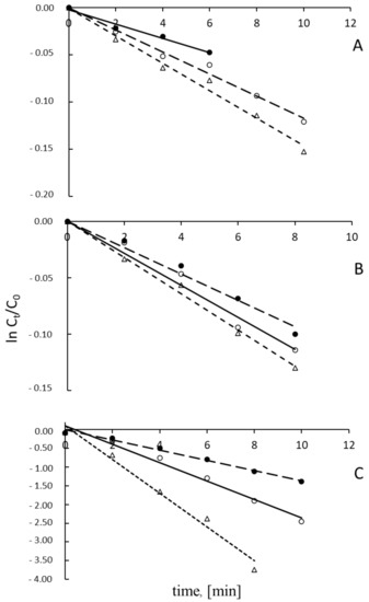 First-order plot of the relative concentrations (C/C0) vs. time, obtained upon illumination of air-saturated aqueous solutions, pH 10, 2.0 × 10−4 mol dm−3 of the test-compounds: I (A), II (B), and III (C) with suspended particles of the photocatalysts. The filled circle (●) represents the compounds in the S0-catalyst suspensions, the open circle (o) in the S1-catalyst suspension, while open in the triangle (∆) S2-catalyst suspensions.