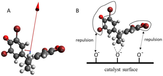 Compound III was completely deprotonated at pH 10, so it is repelled by Coulombic forces by the negatively charged catalysts surface and its adsorption was hindered. However, it could approach the catalyst surface through the methyl groups, as is shown in Figure 6. Quantum-chemical calculation allowed us to determine the value (ca. 8.21 Debye) and direction of the dipole moment of ion III (Symbolized by the red arrow in Figure 6A), which explains the interaction of anion III with the negatively catalyst surface presented in Figure 6B. The weak adsorption of III should affect negatively the photodegradation; however, its rate of degradation was the best among tested compounds. It is probably caused by bromine substituents in the benzene ring, which allows a reductive degradation mechanism. The pronounced differences in apparent decomposition rates, shown in Figure 5C and Figure 7, could not be fully explained in terms of the oxidation mechanism being the only pathway. The observation shown in Figure 5C points to a superposition of (i) one-electron oxidation followed by debromination and further fragmentation, and (ii) dissociative electron transfer resulting in fast debromination. Electron-transfer induced dehalogenation of organic compounds is a common mechanism in their redox chemistry [45]. There were instances where transfer of an electron to a neutral precursor leaves the resulting radical ion in an electronic ground state that is dissociative. The process is called dissociative attachment [46]: Following the electron-transfer event, which is rapid on the time scale of nuclear motion, the ion relaxed along the dissociative coordinate, leading to the scission of one or more bonds. It is believed that, for aromatic halides, the reductive cleavage occurred in a two-step mechanism (RX + e–→ RX•–→R• + X–), with the transient formation of a radical anion (RX•–). In particular, the massively accelerated degradation of III indicated reductive debromination to be very efficient.