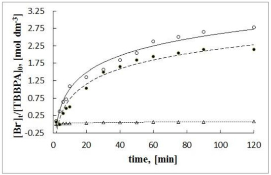 The degradation reaction rate constant for compound III was the highest on catalyst S2, whereas, on S0, it was the lowest. The situation was quite different when considering the rate of bromide ion release (Figure 7). The yield of bromide ion formation during the degradation reaction of III (S1 > S0 > S2) corresponded to changes in the adsorption’s value equilibrium constant of compound III on the catalysts. The condition for the course of the reduction process was the adsorption of the substrate on the catalyst. Horikoshi et al. [47] have suggested the formation of bromide ions from TBBPA degradation in UV irradiated alkaline aqueous TiO2 dispersions. However, the release of Br− can be caused by both the reductive debromination and hydroxyl radical oxidation.