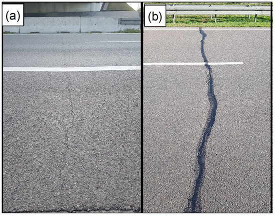 Examples of low-temperature cracks. (a) Unrepaired; (b) Sealed (Expressway S8).
