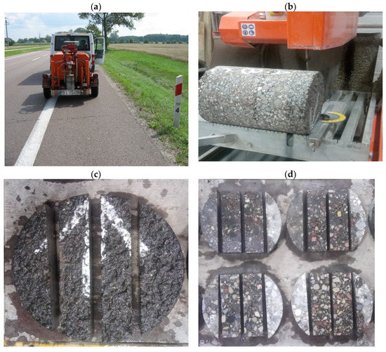 Specimens for laboratory tests were drilled from each of the considered sections in the year 2018, and shortly after specimen collection, they were tested in the laboratory. The locations of specimen collection were chosen randomly. Two cores with a diameter of 300 mm were collected for each pavement layer: wearing course, binder course, and asphalt base. Prismatic specimens were subsequently sawn from the core samples and cut to the dimensions of 40 mm × 40 mm × 160 mm in the case of the wearing course and 50 mm × 50 mm × 160 mm in the case of the binder and base courses. The specimens were sawn from the central part of the core, parallel to the direction of traffic. The process of specimen collection and preparation is presented in Figure 4.