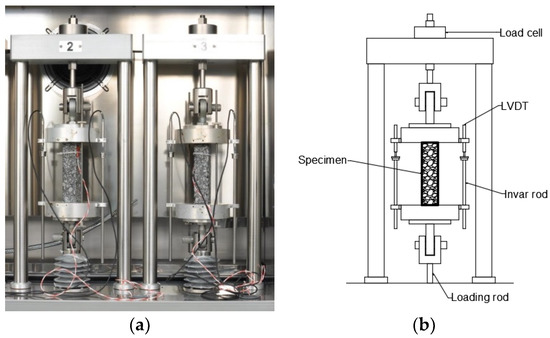 Thermal stress restrained specimen test (TSRST) setup. (a) Photograph of specimens during the test; (b) Schematic view [15].