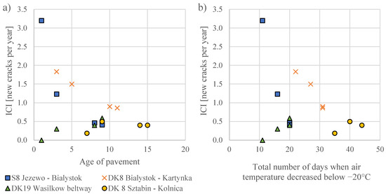 Figure 6a presents relations between the increase in cracking index and the age of pavement in the year of investigation. Each test section is represented by four points, which were obtained on the basis of investigations in particular years: 2012, 2014, 2019, and 2020. Each section was at a different age in the year of investigation and had a different history in terms of winter conditions. Winter seasons in successive years are not equal in terms of low temperatures, as shown in Section 2.1.2. The total number of days with extremely low temperatures, below −20 °C, counted over the entire period since the section was opened for service is proposed by the authors as a measure of the history of winter conditions. Figure 6b presents the relationship between the annual average increase in cracking index ICI and the total number of days on which air temperature decreased below −20 °C.