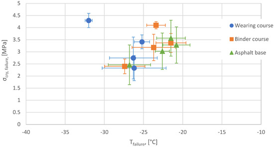 The TSRST results (failure temperature, cryogenic stresses at failure and at −20 °C) of samples obtained from field sections are presented in Table 3, Table 4 and Table 5, separately for each asphalt layer. The coefficient of variation (CV) given in Table 3, Table 4 and Table 5 expresses the ratio between standard deviation and mean value of test results. The results are also presented graphically in Figure 7 and Figure 8.