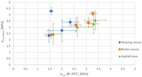 Figure 7 presents the relationship between the maximum cryogenic stresses at failure and temperature at failure. The relationship between cryogenic stress at a temperature of −20 °C and at failure temperature is presented in Figure 8. Each point in Figure 7 and Figure 8 represents the mean obtained from three specimens per section and layer. The error bars shown in Figure 7 and Figure 8 represent standard deviations of results obtained for the three specimens.