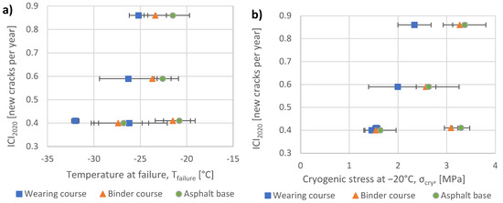 Relations between the increase in cracking index obtained for the period from the year of pavement construction up to 2020 (ICI2020) and the results of the TSRST test. (a) Failure temperature; (b) Cryogenic stress at −20 °C.