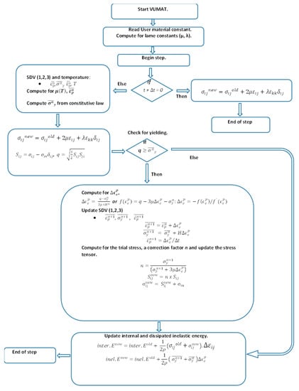 To make it easier to implement the microstructure- and dislocation-based constitutive model as a VUMAT user material subroutine, the implementation algorithm was written following the logic of the flow chart shown in Figure 2. Coding for this subroutine was based on the theory of plasticity and radial return mapping presented in Appendix A.