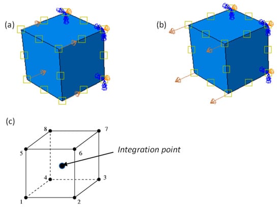 The roller support condition to restrain the surface in a direction parallel to the loading direction was applied to the four nodes of the surface opposite to the surface onto which load was applied. The dimensions of the cube were arbitrarily taken as (10 × 10 × 10) mm and the cube meshed using the eight-node linear brick C3D8R element shown in Figure 3c, with reduced integration and hourglass control settings. This type of mesh is simple and appropriate for the cubic element models of components with regular straight-edged shapes.
