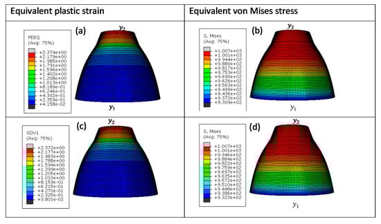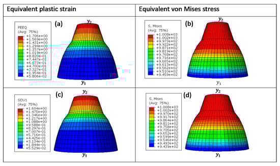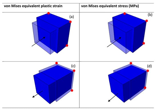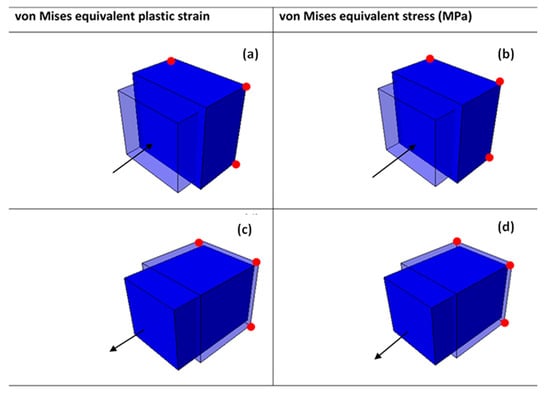 The equivalent plastic strain and equivalent von Mises stresses were obtained at the integration/Gauss point shown in Figure 3c. Lateral expansion of the cube is realised in the case of a compression test from the surface where load was applied to the surface under the constraints, as shown in Figure 4a,b and Figure 5a,b. To the contrary and as expected, the deformed tensile element is characterised by lateral reduction in the cross-sectional area, as shown in Figure 4c,d and Figure 5c,d. The values of equivalent von Mises stress and equivalent plastic strain shown in the keys of Figure 4 and Figure 5 were obtained from the field output.