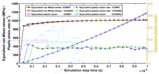 With dynamic explicit integration of instantaneous imposed velocities, step times are important since long step times could cause excessive deformation of elements. In some instances, the opposite faces may cross over each other (in compression) causing the job to exit with an error, whilst for very small step times, the elements may not reach the plastic deformation state. For single element tests, the dynamic explicit integration option with total step times (t) of 0.03 s, 0.003 s, and 0.001 s for velocities of 0.1 m/s, 1 m/s, and 4 m/s, respectively, were found to give sufficient deformation without excessive distortion of the element. For velocities beyond 4 m/s for this kind of numerical model, the simulation aborted even for very small step times due to excessive deformation of the model. Figure 6 shows the change in the values of equivalent von Mises stresses, plastic strains, and plastic strain rates for samples C with increasing simulation time in VUHARD and VUMAT for a velocity of 4 m/s. In both subroutines, the plastic strain is initially zero (during elastic deformation) before increasing uniformly to a maximum value, and therefore the rate of deformation (plastic strain rate) is constant during this period, as seen in Figure 6. Both VUMAT and VUHARD show fairly similar values of average plastic strain rate of approximately 350 s−1 in the figure. The equivalent plastic strain and flow stress curves generated from the two subroutines also coincide for the entire and a large part of the simulation step time, respectively.