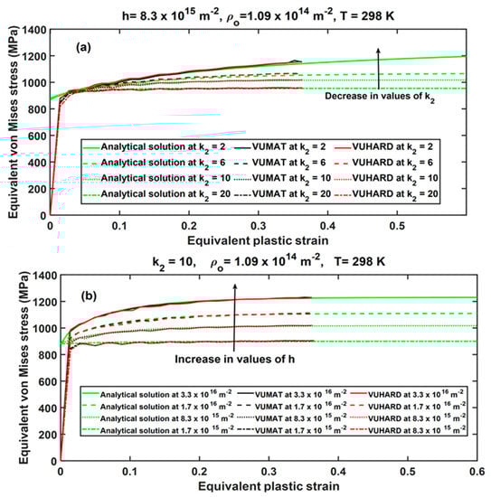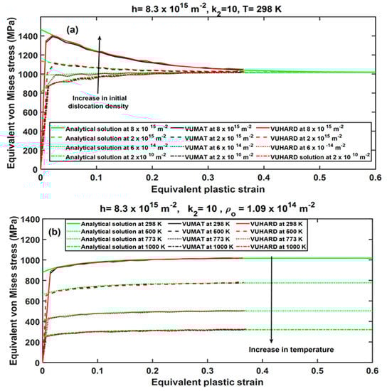 As seen in these figures, the results from the numerical models derived in VUMAT and VUHARD, and those from the analytical solutions developed here, coincide for a large part of the flow curves. The opposing effect of parameters and is well articulated in the numerical model where the flow stress increases with decreasing values of the parameter , whereas it increases with increasing values of the parameter as seen in Figure 7. Similar observations were reported in []. Figure 8 shows the effects of initial dislocation density and temperature on the numerical solutions obtained from the VUMAT and VUHARD subroutines developed here and the analytical solutions, all at the same strain rate of 350 s−1. It is clear from Figure 8a that for very high initial dislocation densities, the flow stress curve is characterised by high initial peak stresses followed by a decrease in flow stress. For very low initial dislocation densities, the peak stresses are lower, and the material experiences strain hardening. Similar observations were noted in [], and the theory behind this phenomenon was presented.