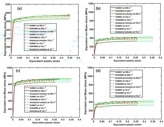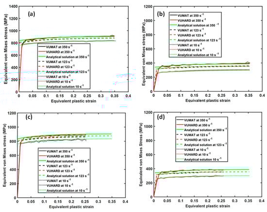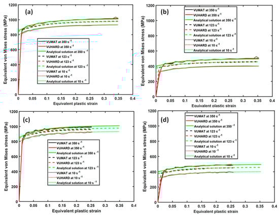 As seen in these three figures, the scaling down and upturn of flow stress at high temperature and with an increase in strain rate, respectively, is well articulated. For the two cases of strain rate and temperature, the results from the numerical models based on the VUMAT and VUHARD subroutines and those derived from the analytical solution developed here are nearly overlapping over most of the equivalent plastic strain range. This confirms that the two subroutines work well in the loading conditions applied.