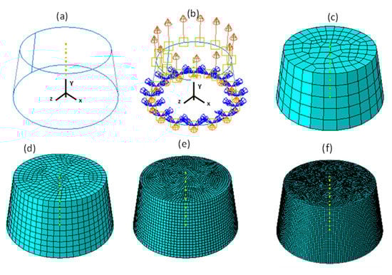 (a) A three-dimensional (3D) numerical model for the necking of a circular bar with (b) imposed loading and boundary conditions, (c) 2 mm mesh size (475 elements), (d) 1 mm mesh size (3550 elements), (e) 0.5 mm mesh size (28320 elements), and (f) 0.25 mm mesh size (126038 elements).
