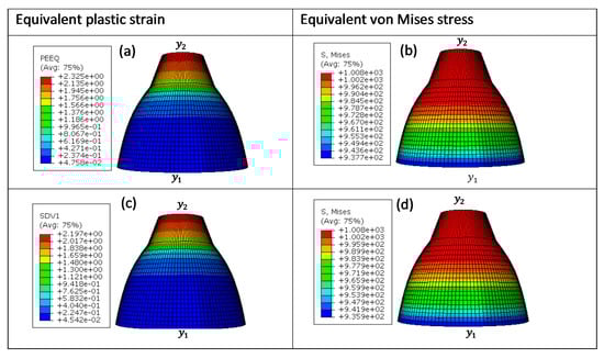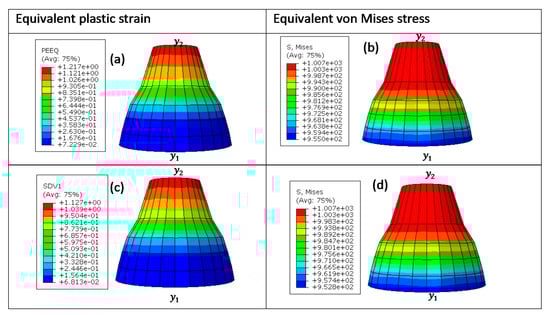 The previous and current values of equivalent plastic strain in a step were defined as old and new solution-dependent variables (SDV1), respectively. Thus, the increment of plastic strain was obtained as the difference between these two states. The equivalent plastic strain rate component of Equations (1) and (3) was expressed from the increment in equivalent plastic strain () for a time increment size () as follows:
