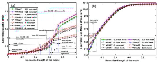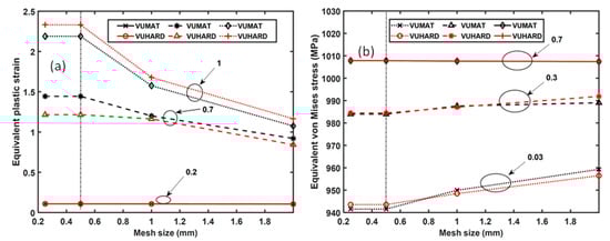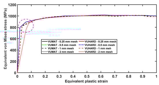 - For multiple element models with different mesh sizes, both the VUMAT and VUHARD subroutines displayed similar distributions of equivalent plastic strain and von Mises stress.
