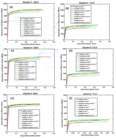 - The results of simulation of samples C, D, and E using single element numerical models based on the VUMAT and VUHARD subroutines and those derived from the analytical solutions at the same conditions of strain rate and temperature were nearly overlapping over most of plastic strain range.