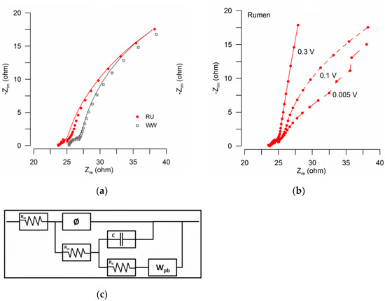 EIS was performed on anodes and cathodes to quantify and characterize differences in the internal resistance of MFC reactors, with particular interest in the electron transfer resistance in cathodes enriched with the rumen inoculum. EIS analysis of the brush anodes tested at OCP showed ohmic resistances of 16 Ω and 6 Ω for RU and WW, respectively. This might explain the observed slight differences in anodic potentials between these systems (Figure 3). To account for the role of the rumen bio-cathode on power production increases, cathodic EIS was performed at a poised potential of 0.1 V, estimated as the operational cathodic potential at a high current (Figure 3). EIS data were analyzed by fitting an equivalent circuit model (Figure 6) that included ohmic (RΩ), charge transfer (Rct), and diffusion resistance (Rd) based on a constant phase element (CPE) model with a double layer charging feature of porous electrodes [46], in this case, the electrochemical properties of the biocathode. To account for mass transfer, the second arc was modeled by adding a capacitor (C) and a porous bounded Warburg (Wpb) element [47]. The equivalent circuit used was an adaptation of a bioanode model previously used by Jung et al. (2011) [48]. Data were successfully fitted, obtaining goodness of fit (expressed by χ2) from 10−5 to 10−3 [49] (Table 2).