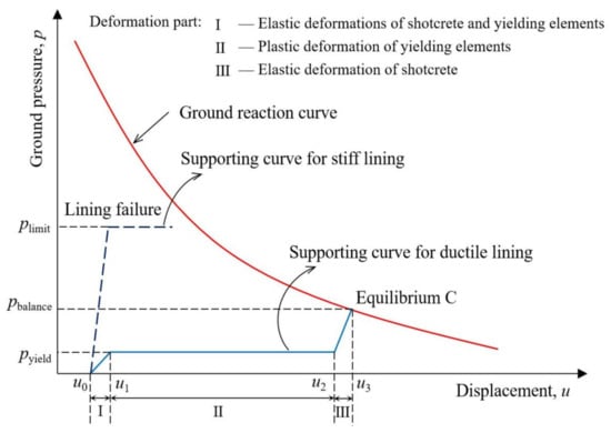 Comparison of supporting characteristic curves between stiff lining and ductile lining [35]. Reproduced with permission from [37].