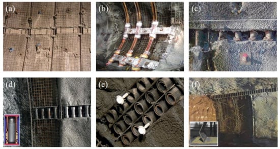 Illustration for applications of yielding elements in tunnels; (a,b) porous concrete-based element; (c–e) steel pipe-based element; and (f) steel plate-based element. Reproduced with permission from [37].