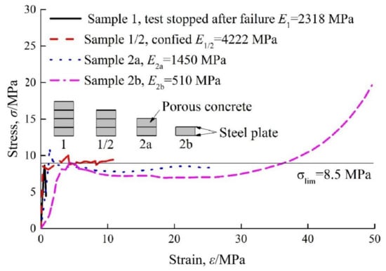 Hidcon element, as shown in Figure 2a,b, is usually made of high-strength concrete matrix with porous additives [24]. Sometimes, tunnel engineers prefer to call it the “porous concrete element”. If the Hidcon element is adopted as the yielding element used in shotcrete linings, some other additives are also often used, in order to increase the compressive strength and deformability of this element [78]. Taking the Hidcon element used in the Saint Martin La Porte access adit of the Lyon–Turin Base tunnel as an example, steel fibres and hollow glass particles were applied in the elements [79]. The addition of steel fibres led to a significant improvement of element strength, and the hollow glass particles contributed to an increase of element controllable compression value, as a result of particles collapsing at a predefined compressive stress.