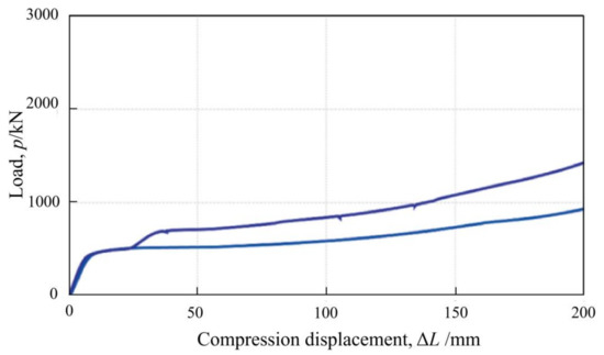 Up to now, a good Lining stress controller consists of axially loaded steel pipes, where additional pipes are simultaneously installed at both ends of the element, aligned concentrically with the load-bearing pipes [24], as shown in Figure 2d. The development of load-bearing pipe buckling folds either inwards or outwards is strictly restrained due to the presence of these additional guiding pipes installed concentrically. Lining stress controller can take advantage of rationally symmetrical cylinder buckling in this way, making its load-displacement behavior better match the strength development of shotcrete. Obviously, it is very convenient to adjust the bearing capacity and allowable shortening value of the LSC element by flexibly determining the number and length of steel pipes used in the element. Figure 4 exhibits the load-displacement curve for a LSC element, where four yielding steel pipes are contained and two of them are 30 mm shorter in length. It can be seen that a practically linearly increasing load resistance is provided by the LSC element until its shortening value of 80 mm. Subsequently, its load resistance oscillates within a stable range of 2050 kN and 2500 kN, triggered by pipe buckling.