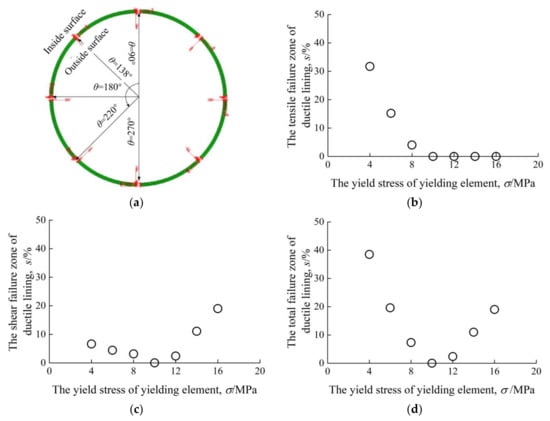 Influence of yield stress of yielding element on shotcrete lining. (a) Installation locations of yielding elements. (b) Tensile failure zone of shotcrete lining. (c) Shear failure zone of shotcrete lining. (d) Total failure zone of shotcrete lining.