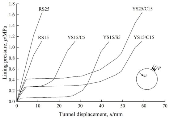 Ramoni and Anagnostou [56] attempted to use a numerical method to provide some supporting characteristic curves for several different types of tunnel linings, as shown in Figure 8. The numerical study is conducted in a tunnel subjected to a hydrostatic pressure, therefore, the lining pressure p and tunnel displacement (the radial displacement of inner contour of lining) u in Figure 8 keep the same in each direction. Table 6 lists the detailed components of these linings. Under the same geological conditions, results in Figure 8 well validate the supporting effect of ductile linings is significantly influenced by those factors, as mentioned previously. Based on the analytical computation equations for support characteristic curve for ductile lining, our group has successfully reproduced one of the curves in Figure 8 [85]. Of course, tunnel engineers can now easily, by using advanced computer technologies, obtain the estimation of tunnel performance in situations of different ductile lining designs. However, the premise is that there should be a preliminary design guidance, in turn providing reliable verification of the numerical design method.