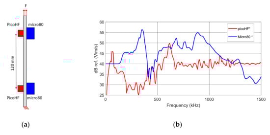 (a) Location of the sensors on the specimen (b) Frequency sensitivity functions of picoHF and micro80 sensors used to capture acoustic emission during tensile tests in composite laminates (calibration curve obtained on steel block with reciprocity method).