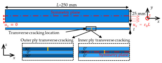 Matrix transverse cracking in 90 deg. inner or outer ply is simulated (Figure 2). It can be noted that for [90n/0n/90n], only one outer ply crack is considered. The strain at first transverse cracking depends on the ply stacking and thickness (Table 3), which can be predicted using either the CC [37] or equivalently using the CZ model [43,44].