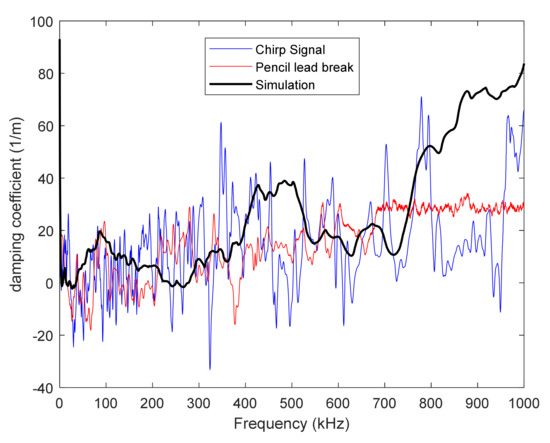 Acoustic emission simulation requires considering, on the one hand, the acoustic wave propagation and, on the other hand, the acquisition chain including the sensor effect. Experimental investigation of acoustic wave propagation shows that the amplitude of the wave decreases when going away from the AE source, which highlights a damping of the signal. Damping is defined using Rayleigh parameters and related, respectively, to low- and high-frequency damping. These parameters are identified experimentally by emitting a source signal which is then captured (micro80 sensor) at different distances to the emitting sensor. Two different artificial sources are used, namely, a chirp signal which excites all the frequencies up to 1.2 MHz and a pencil lead break, i.e., the failure of a 2H graphite lead. The damping coefficient is calculated based on signals S detected at two positions and (Equation (1)).