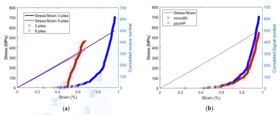 Cumulated localized signal number and stress as a function of strain for (a) [0/90/0] and [03/903/03] specimens using the micro80 sensor and (b) micro80 and picoHF sensors for [0/90/0] specimens.