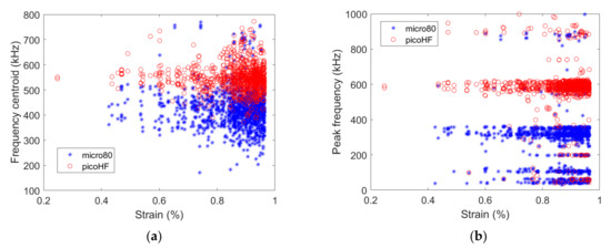 For the [03/903/03] specimen, the numbers and positions of localized sources by both the micro80 and picoHF sensors are similar, resulting in similar variations as a function of strain (Figure 4b). This means that both sensors are responsive to the same sources. Figure 4b shows the cumulated number of localized sources for both specimens obtained with the micro80 sensor. Therefore, the overall acoustic activity is similarly captured by both types of sensors. A deeper insight into the AE results obtained with both sensors can be established by studying the waveforms of each signal detected by the sensors. Temporal and frequency descriptors of these waveforms can be calculated and compared for both sensors. Figure 5 shows the frequency centroid and peak frequency of each AE signal as a function of strain for both sensors for the [0/90/0] specimen.
