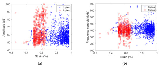 The range of strain over which signals are acquired strongly depends on the ply thickness. For the [0/90/0] specimen, the signal amplitude mainly varies between 45 dB and 70 dB, especially for strain smaller than 0.6%. For larger strain levels, signals with a larger amplitude up to 90–100 dB are recorded. The corresponding frequency centroid varies between approximately 400–500 kHz for strain smaller than 0.6%, signals with either smaller (down to ~250 kHz) or larger (up to ~700 kHz) frequency centroid are acquired. For [03/903/03] specimen, except for some isolated signals recorded for strains smaller than 0.5%, the range of amplitude 45 to 100 dB and the 200–700 kHz range of frequency centroid are covered by the acquired signals.