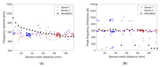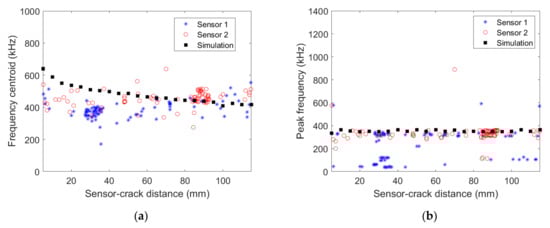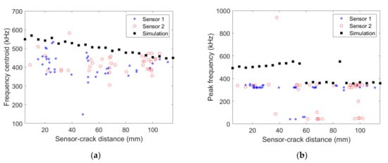 (a) Frequency centroid and (b) peak frequency as a function of the distance between the AE source and the micro80 sensors obtained experimentally for the [03/903/03] specimen and numerically.