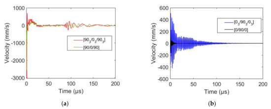 Out-of-plane velocity as a function of time obtained at crack epicenter for (a) outer ply transverse cracking in [90n/0n/90n] specimens and (b) inner ply transverse cracking in [0n/90n/0n], (n = 1 or 3).
